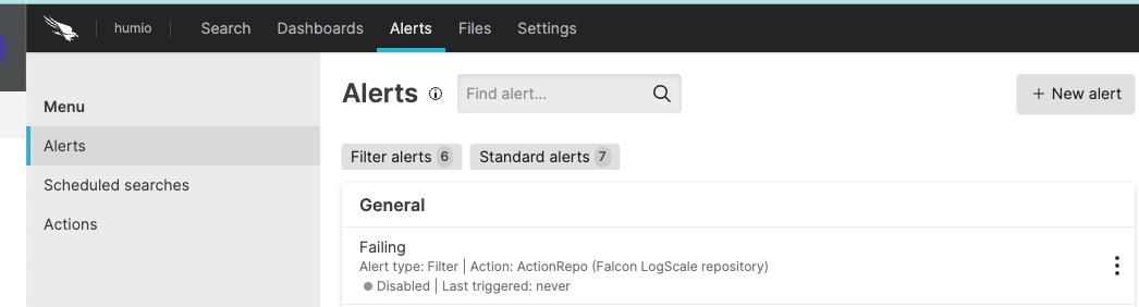 Click the tab on the top bar of the User Interface and select from the menu on the left: the full list of available alerts appears. They can have labels attached to them which are displayed next to the alert name. This can be a useful way to tag the alerts with meaningful data and to help when trying to locate them with a certain tag.