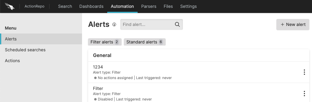 Click the tab on the top bar of the User Interface and select from the menu on the left: the full list of available alerts appears. They can have labels attached to them which are displayed next to the alert name. This can be a useful way to tag the alerts with meaningful data and to help when trying to locate them with a certain tag.