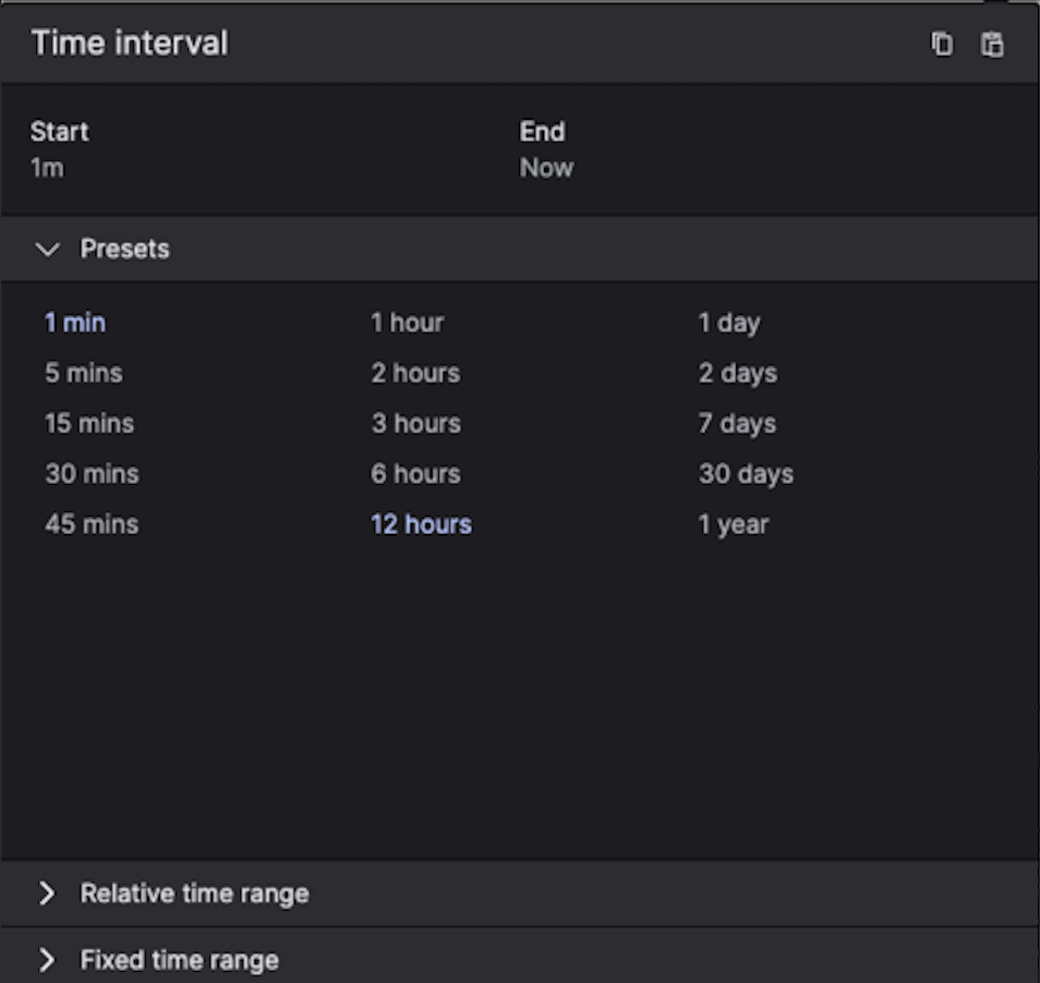 • Use the magnifiericon to to quickly extend the time range by the same interval (for example, from 5 min to 10 min ago), making it easy to expand your search scope incrementally.