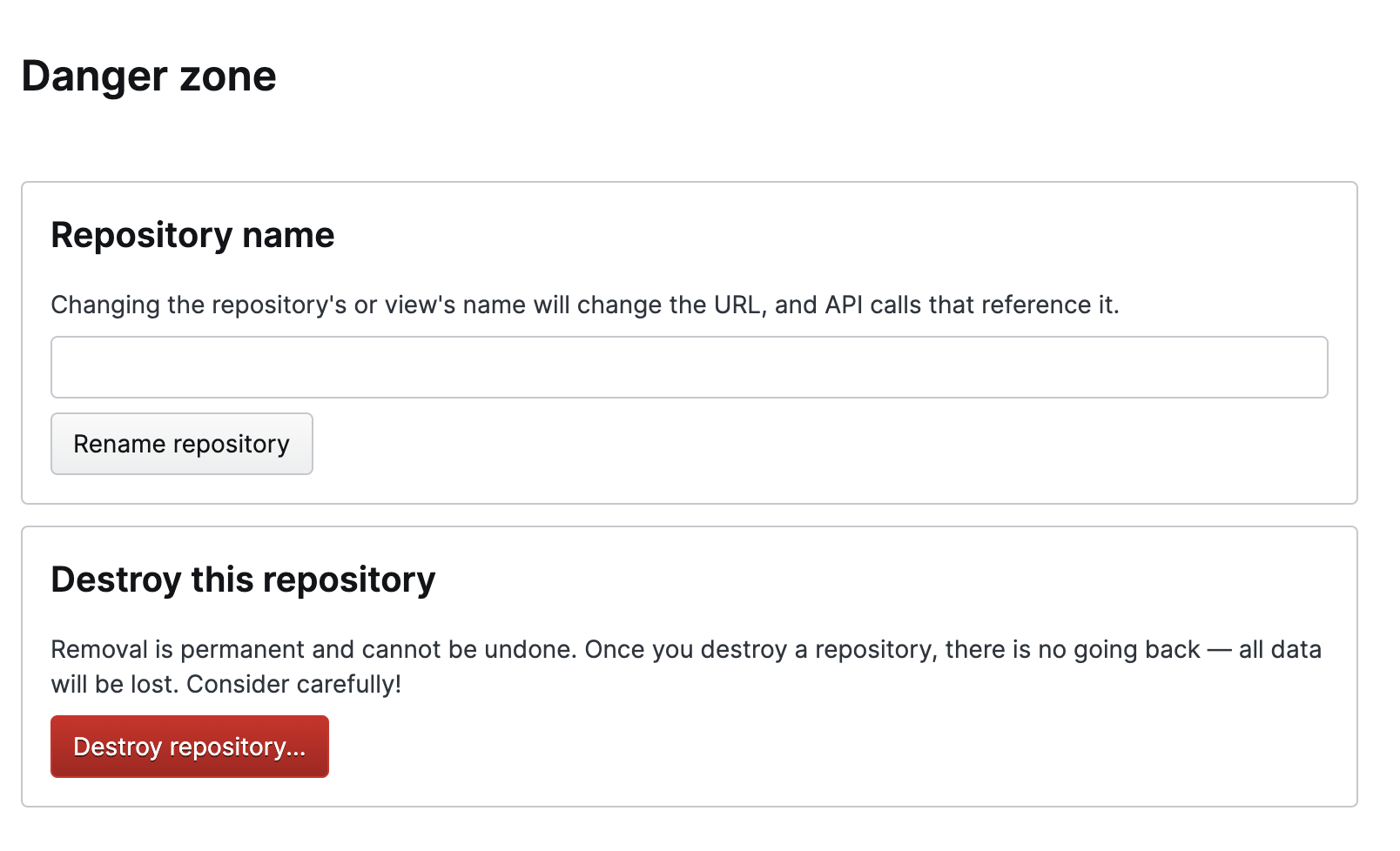 The exact list of available options in this UI page will depend on the user permissions and repositories available. System repositories, for example, cannot be deleted and so the Danger Zone will not be shown. The personal Sandbox repository can't be deleted, and can't be configured with multiple users.