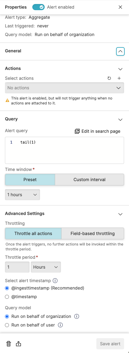 • Alert Enabled indicates that the alert is enabled (new alerts are automatically enabled). To disable the alert, untoggle this button. Disabled alerts do not execute the corresponding query or trigger actions.