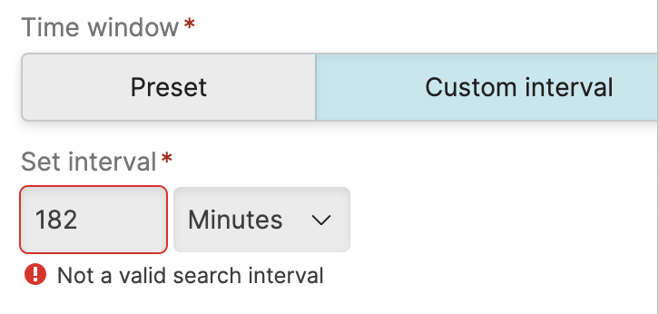 • Time window — allows to set the time interval for the alert (in seconds, minutes, etc.). In Aggregate Alerts, available options are Preset (choose from a predefined list) or Custom interval to set other preferred time intervals.
