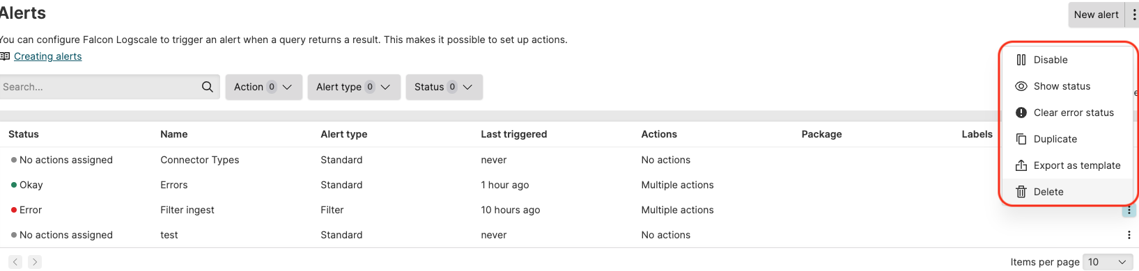 To manage an alert, click the three-dot menu icon ⋮ next to the alert name and select one of the following options: