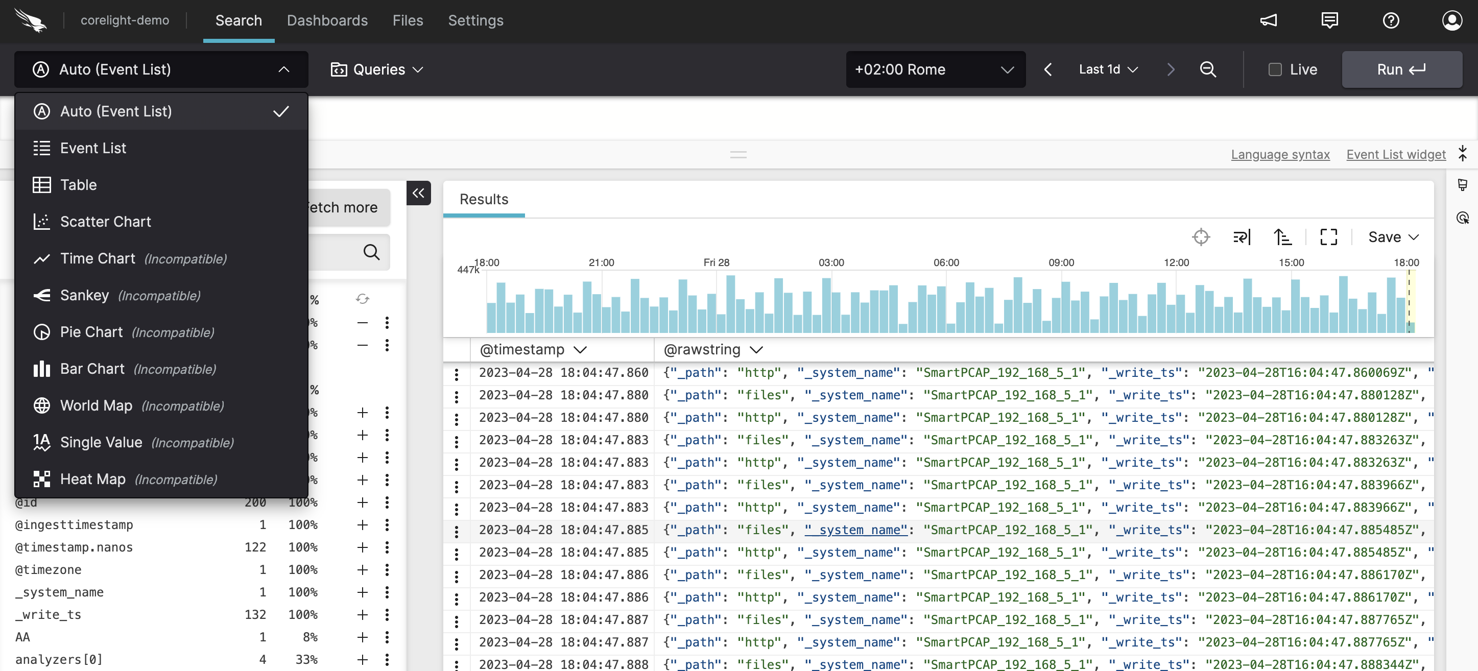 From the tab, click the Widget selector dropdown to select which display type/widget to use for your results (default is ). Be aware that not all data is compatible with all widget types. Incompatible data for a given widget type is specified on the menu.