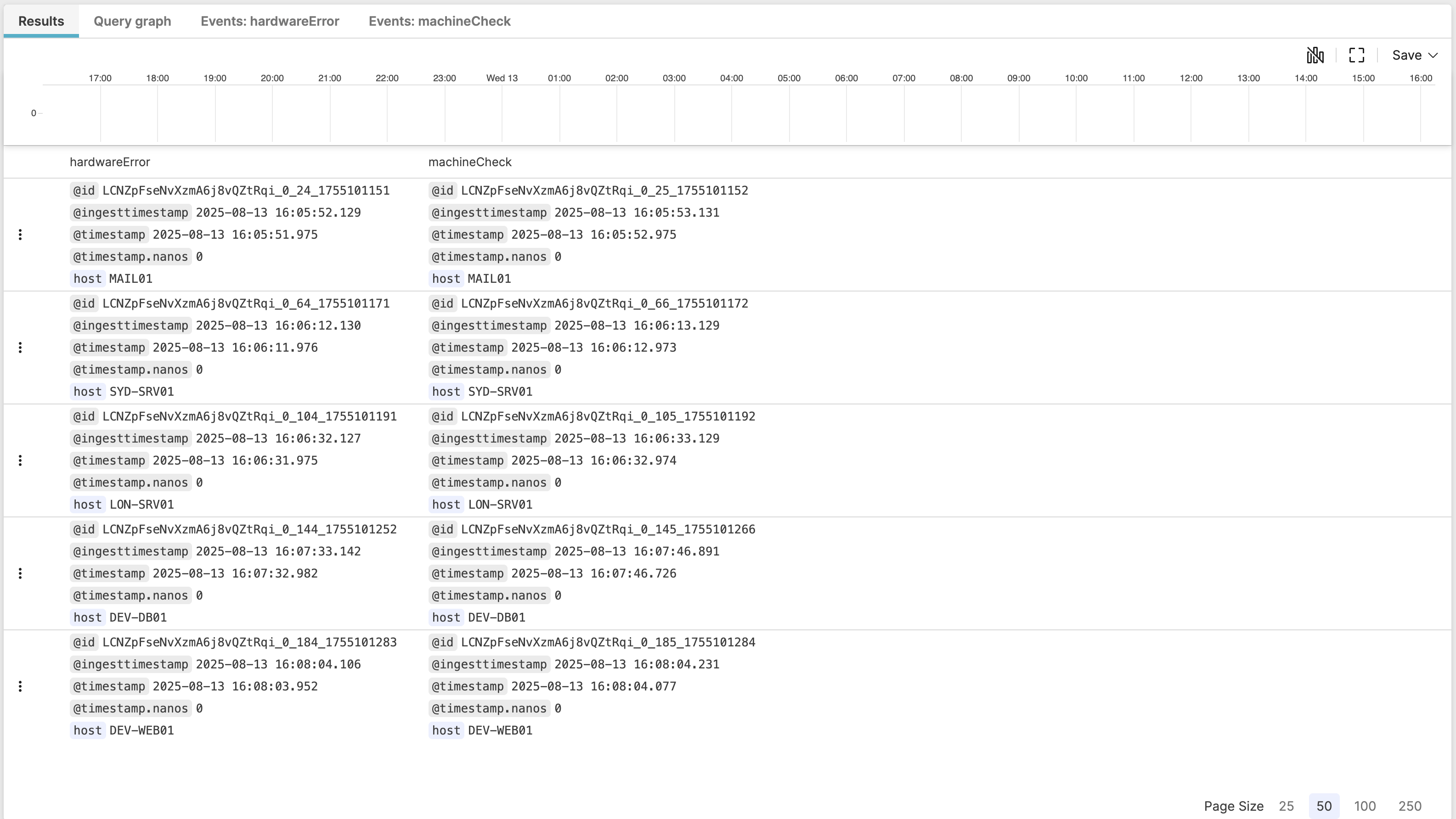 correlate()function in this query has two named queries,machineCheckandhardwareErrorwhich each have a tab of matching results: