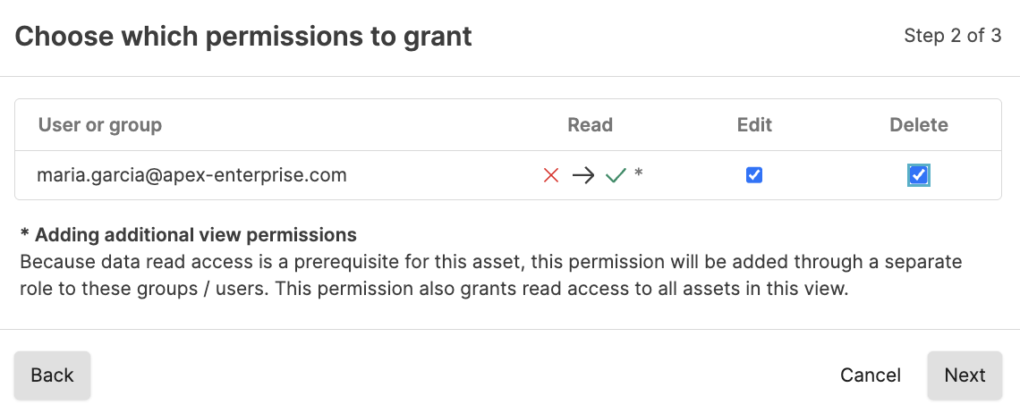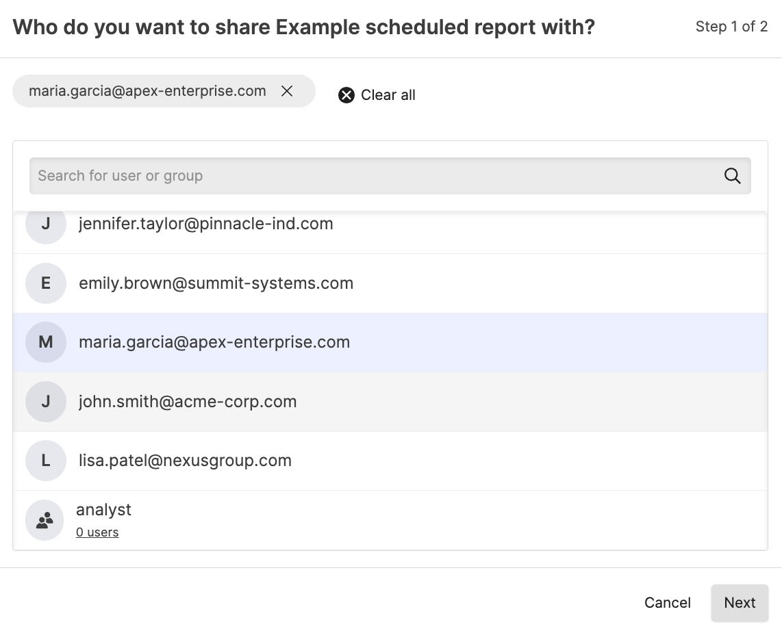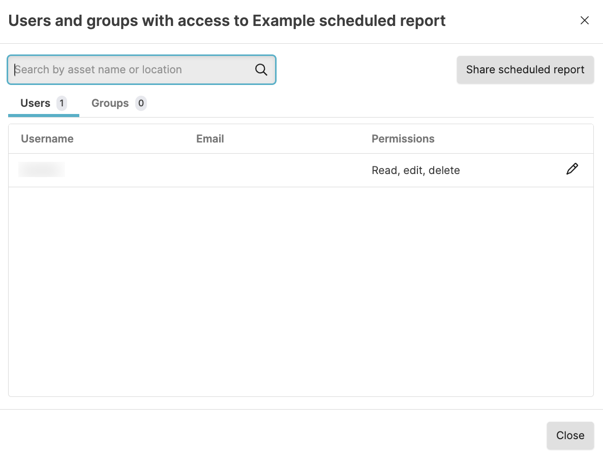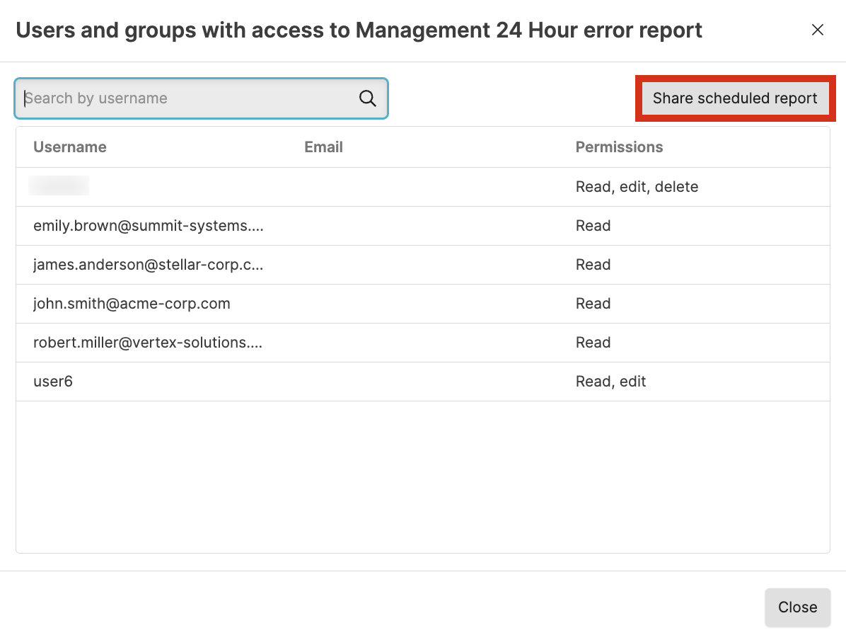 Sometimes you might want to collaborate with another user on a scheduled report, but that user does not have permissions to scheduled reports in the view. If you have permissions to do so, you can grant permissions to that user to edit and delete a particular scheduled report in a view. For more information about asset permissions, see Asset permissions.