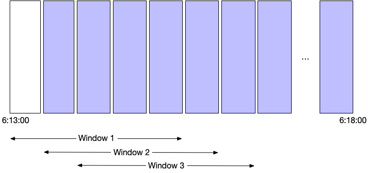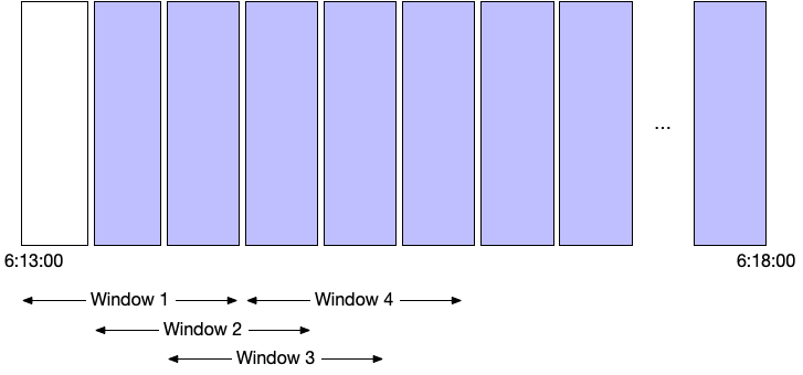 A graphical representation, showing the span of each computed window is shown below.