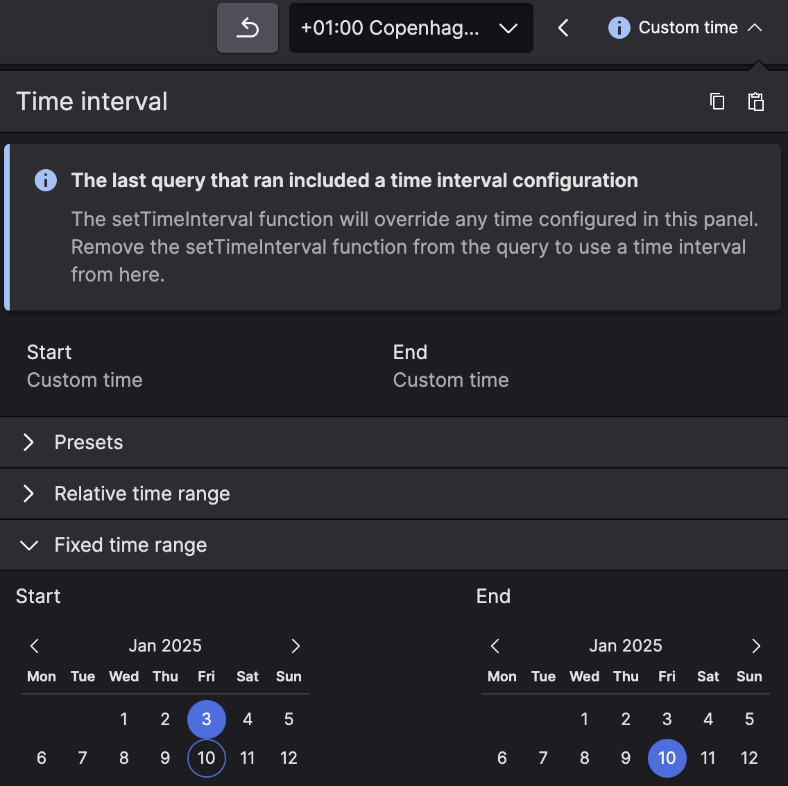 Fixed Time Range allows selecting fixed start and end dates as the time interval.