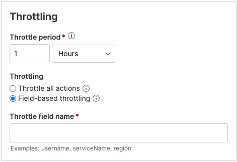 Say you have an alert that triggers when a machine is running out of disk space: you want to throttle further messages for the same machine and you still want to receive a message if another machine also starts running out of disk space within the throttle period. You can decide to throttle on only events with identical field values, and select the field in your logs containing the name of the machine.