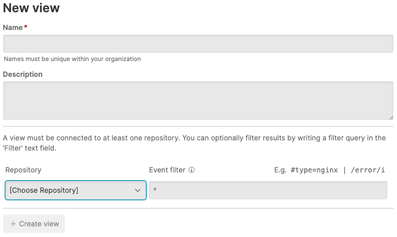 • Event filter: use this field to set a filter query for how you want data filtered, for example you can limit the search to a subset of data. The filter query is applied as a prefix to searches in the associated repository, read Query Filters for more information on the filter operators' syntax that can be used when creating a view. Filtering Query Functions cannot be entered in the Event filter field.