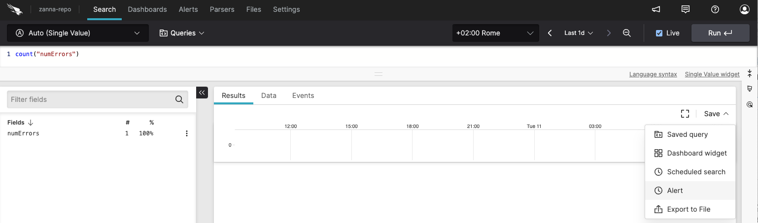 In the example query shown in Creating an Alert we're searching for events in which the web server recorded a log level equal to ERROR.