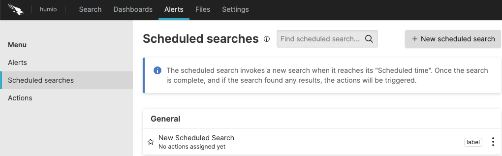 Click the tab on the top bar of the User Interface and select from the menu on the left: the full list of available Scheduled Searches appears. They can have labels attached to them which are displayed next to the scheduled search name. This can be a useful way to tag the scheduled searches with meaningful data and to help when trying to locate them with a certain tag.