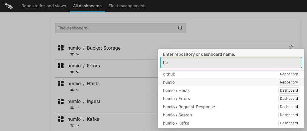 The Jump Panel provides quick access to repositories and dashboards. Press Ctrl+O from anywhere in the web interface and type to filter for specific items: