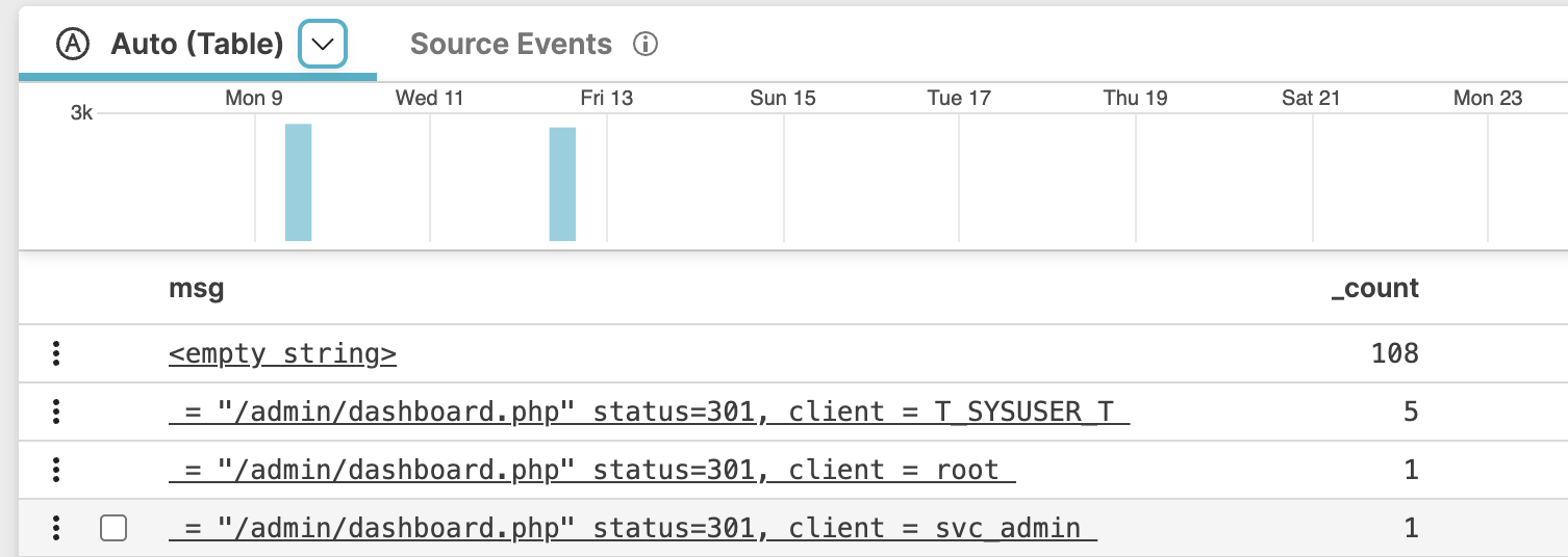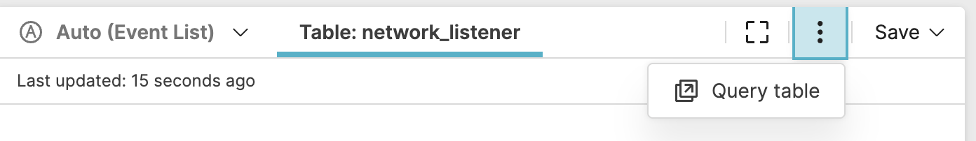 defineTable()function is used in the source query, to display the results of the ad-hoc table defined by the function.Click the menu option to return to the query in the default Event List tab.