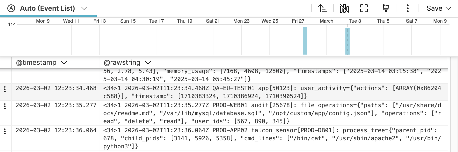 LogScale presents the data returned from a search in a list format. By default, this list includes the @timestamp and @rawstring columns, plus any columns selected in the Fields panel.