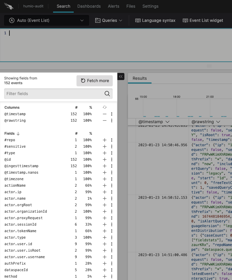 Fields lists all the other fields available for queries, which can be displayed by clicking . Clicking the third column near each field will add a star (for example ★) and move the field to the top of known fields.