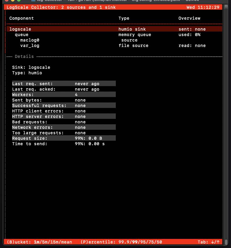 The monitor command launches a monitor terminal application. The monitor mode can be used to see a live view of the running state of the Falcon LogScale Collector. The running sources, queues and sinks can be inspected in real time.