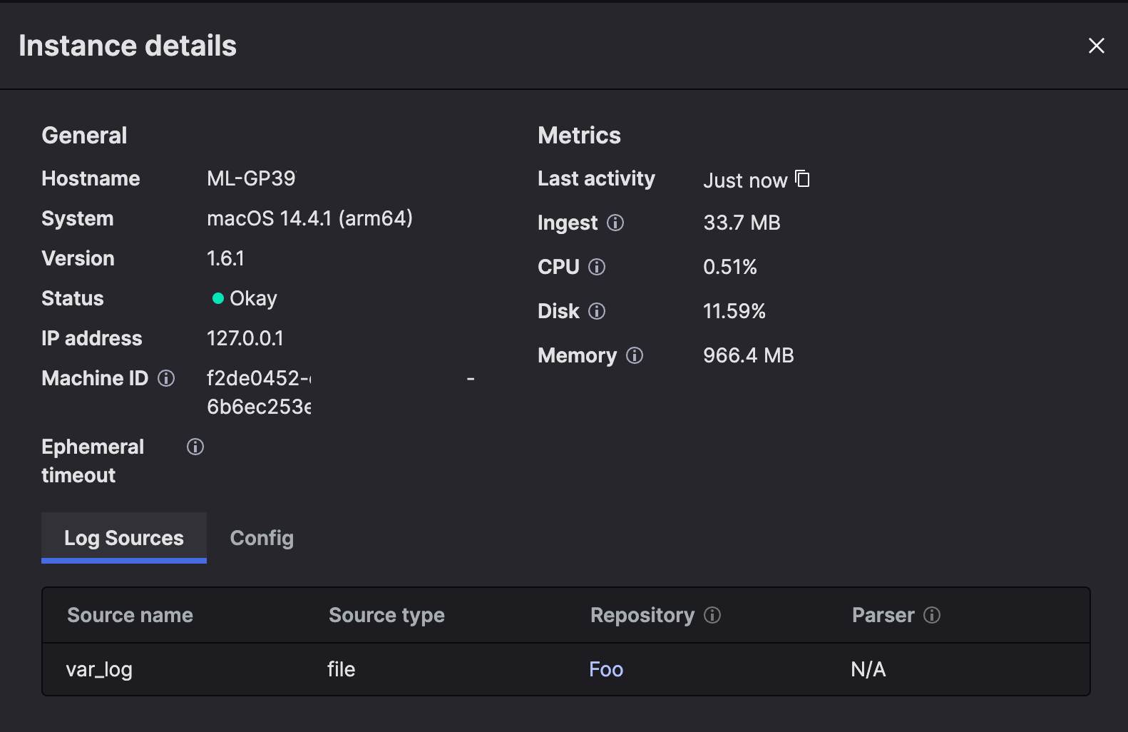 4. Click See more details and a pop-up is displayed with these details about the host, instance and the log sources: