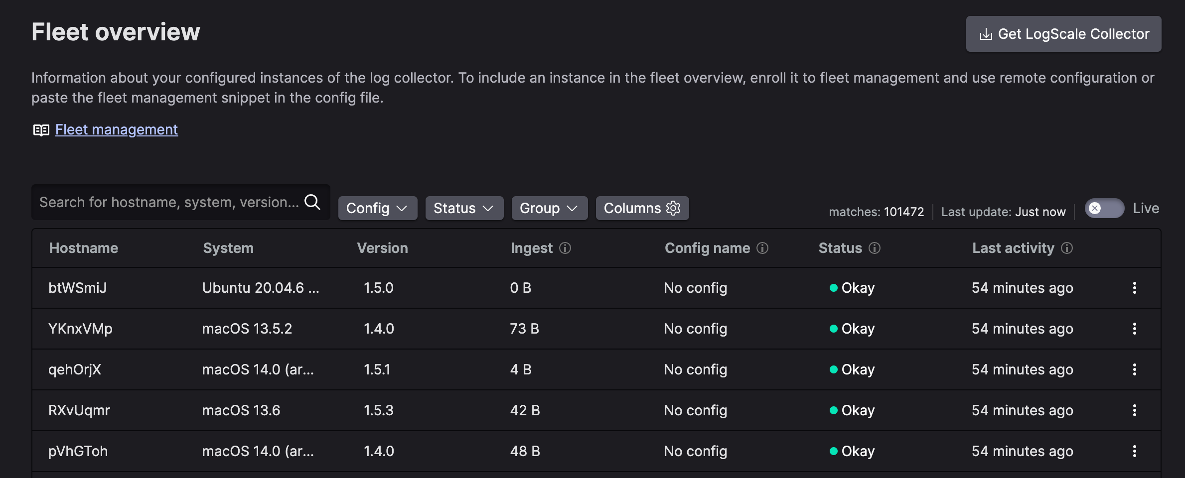 The default overview is Live - meaning collectors that are online at the moment. The Live fleet overview will be continuously updated with details like status updates or new CPU metrics.