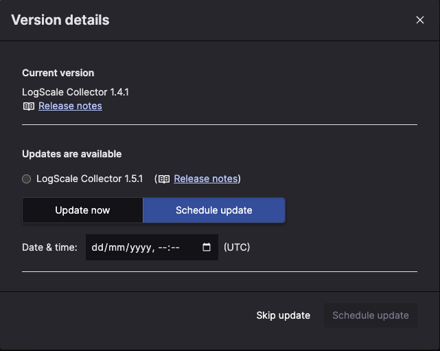 If the version of Falcon LogScale Collector can be upgraded or rolled back the version number on the fleet overview page will be a click-able button. Only instances installed using Full Installation can be managed remotely.