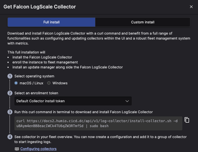 3. Copy, paste and run the curl command in the terminal of your machine to download and install Falcon LogScale Collector.