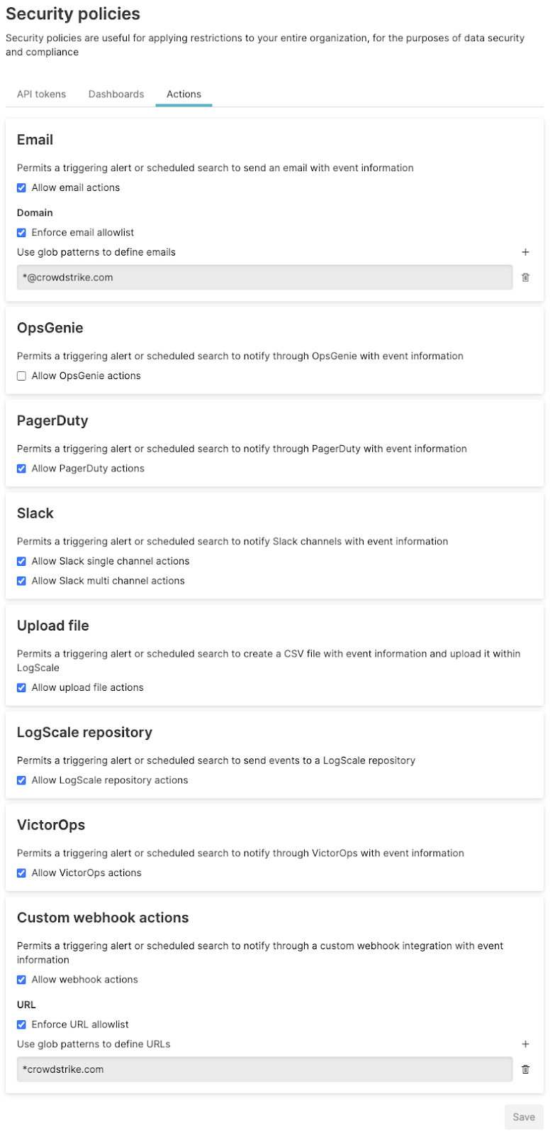When disabling a specific Action type (e.g. OpsGenie), existing actions of this type will be disabled and it will not be possible to create new actions of this type.