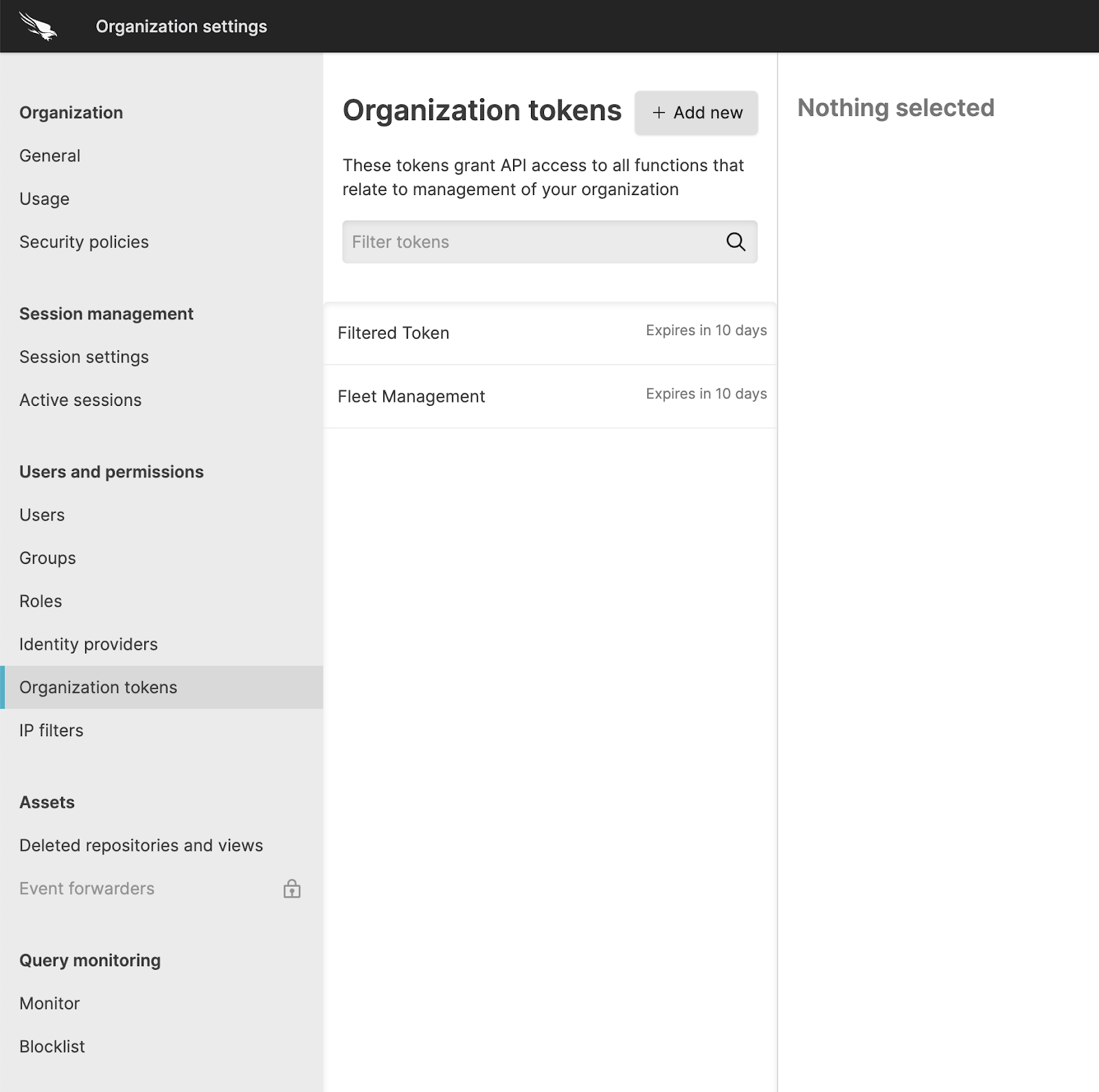 To create a new token, click the + Add new button; for more information on creating new tokens, see Create Organization API Tokens
