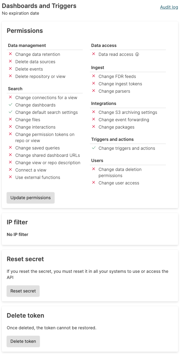 To view the details for an existing token, select the token from the list in the System API Tokens interface. This will show a summary of the organization API token, expiry, permissions, and IP filter information: