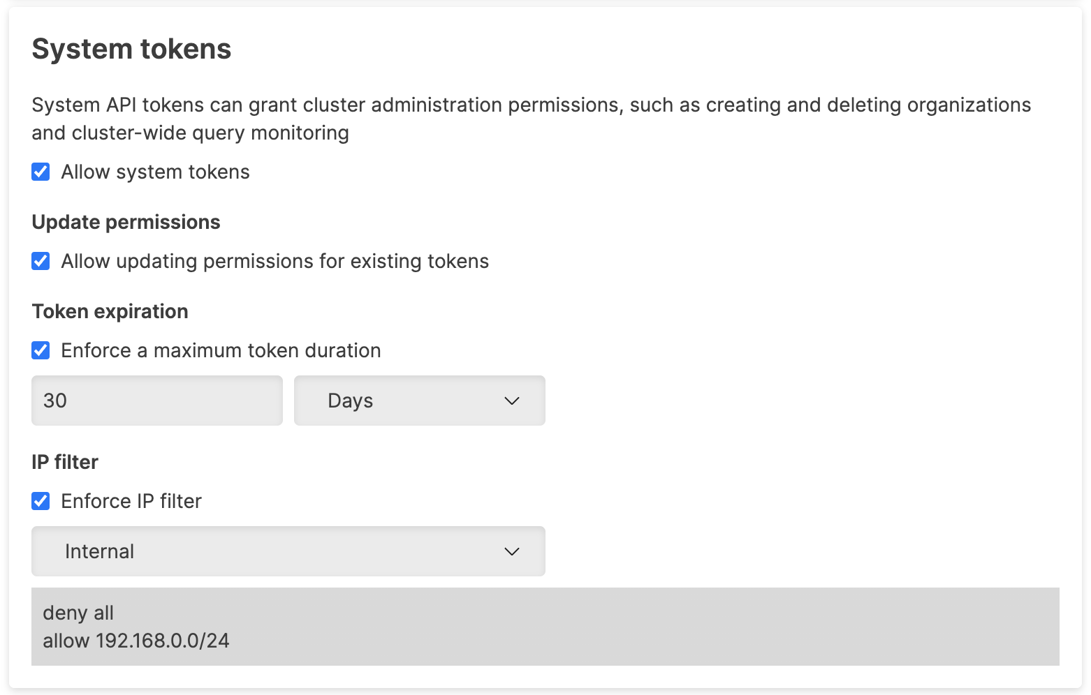 The System Tokens Security Policy controls the ability to create a System API token, the enforced expiry and IP filters. It is also possible to allow updates to permissions for existing tokens.