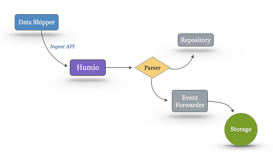 When a log shipper is ingesting data, it is first parsed. Then it is stored in a repository in LogScale and sent through any Event Forwarding Rules on the repository, which can filter and transform the events before forwarding them to an external system through an Event Forwarders.
