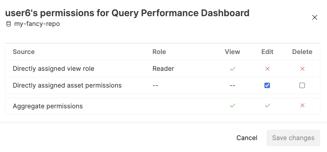 When granting permission to an asset in a repository or view the user does not have permissions to, you are required to acknowledge that by granting permission, the user is automatically given read access.