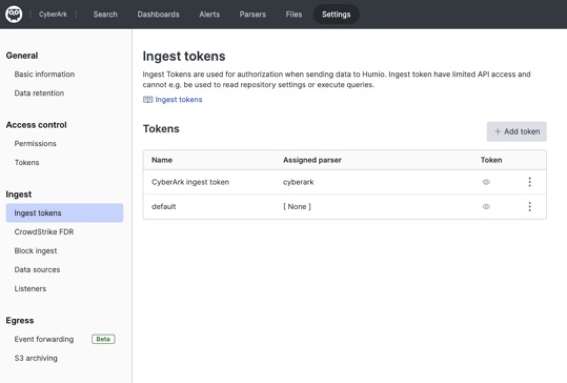 When it's finished installing, from the CyberArk repository, go to the Settings tab. In the Ingest section, click API Tokens on the left. In the right panel, click + Create Token to create a new token. Be sure to assign it the CyberArk parser. You can see the results of doing this in Figure 18, “CyberArk Ingest Tokens”.