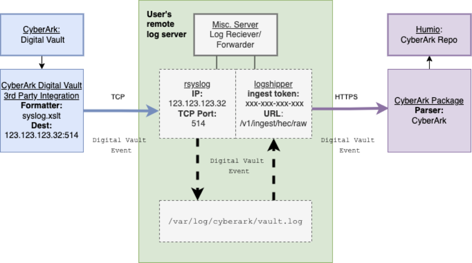 To ingest logs into LogScale CyberArk must be configured to apply a specific log export format so that it sends cef syslog to a customer syslog receiver. From the syslog receiver the CyberArk logs can be written to a local destination and then shipped to LogScale with a log shipper. The LogScale marketplace package assumes that the log shipper wraps syslog in JSON and uses the LogScale HEC ingest API.
