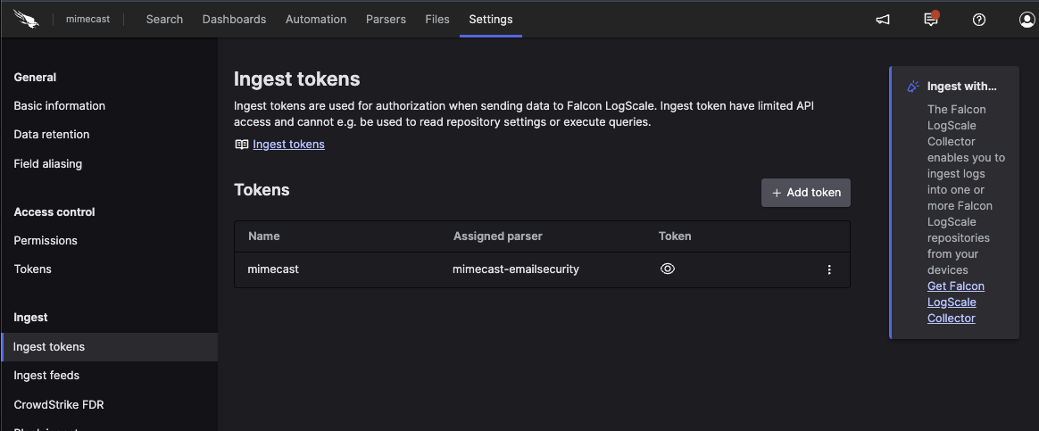 Settingsand underIngestchooseAPI Tokensand create a new token and assign it themimecast-emailsecurityparser. Copy the token.