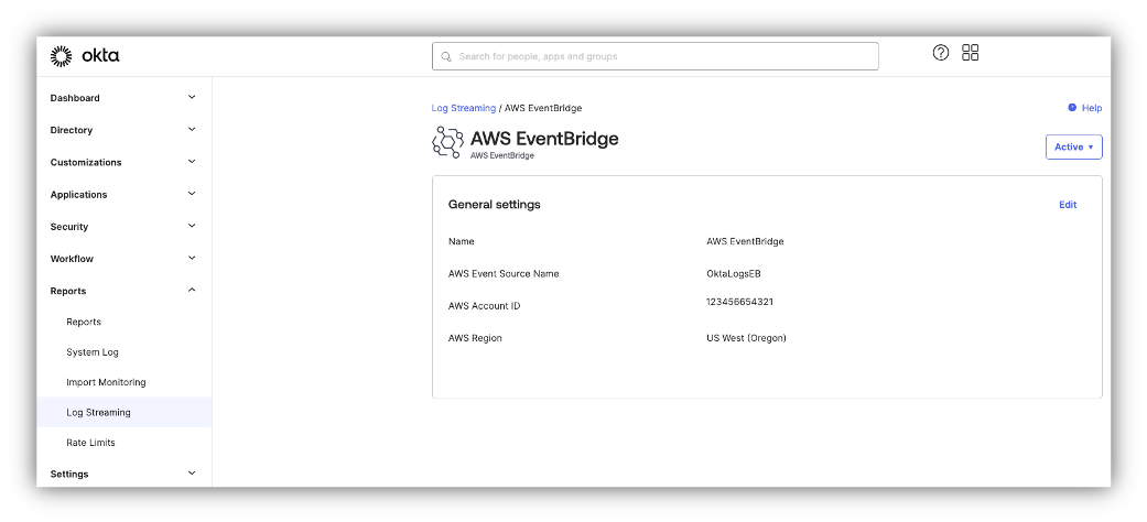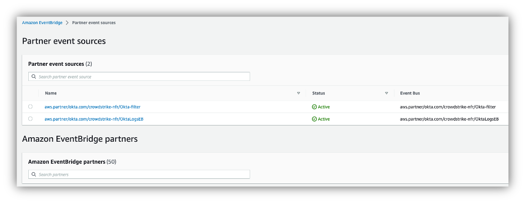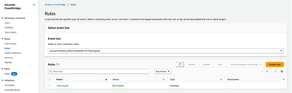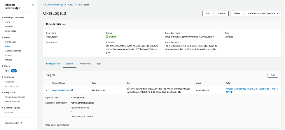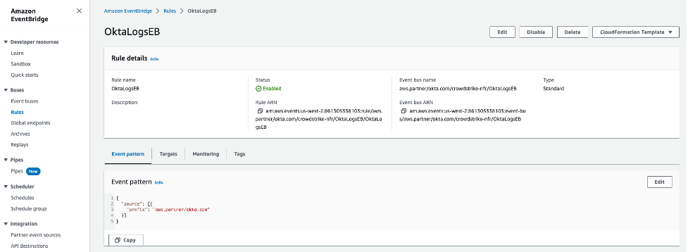 Once you've completed the configuration in Okta, login to the AWS Console to verify that the feed was created. Navigate to Amazon EventBridge™ and click to see details. As shown in the screen-shot below the feed was successfully created: