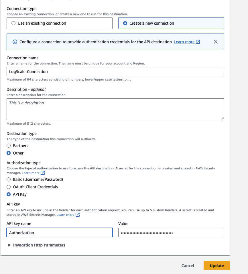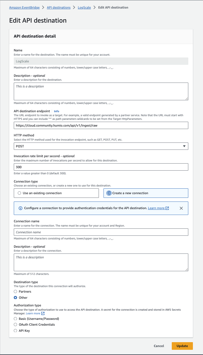 The final step is to configure the API destination for the LogScale cluster. Click on the button under the API Destinations of the Amazon EventBridge™.