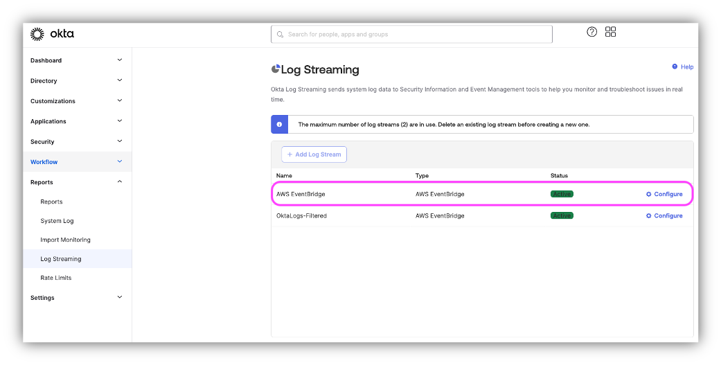 First you need to configure the Okta Log Streaming™ to send the events to AWS EventBridge™. For that, in the OKTA Administration Console navigate to Reports then Log Streaming where you will be given an option to add feeds. Configure a feed to send all Okta events to Falcon LogScale.