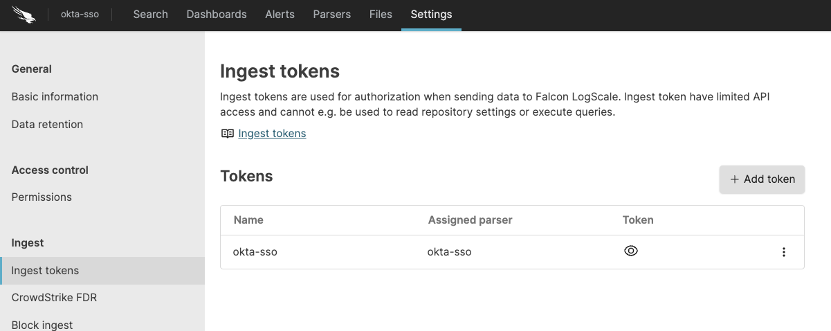 $YOUR_LOGSCALE_URLneeds to be a valid FQDN of your LogScale instance and$INGEST_TOKENis Ingest Tokens the assigned to the okta-sso parser.For example: