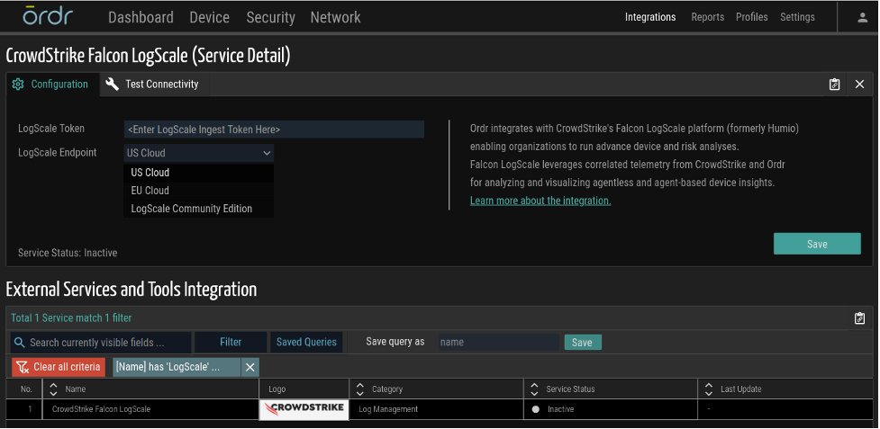Integration with CrowdStrike Falcon LogScale enables organizations to run advance device and risk analyses by leveraging the correlated telemetry from CrowdStrike and Ordr. See https://ordr.net/ for more information.