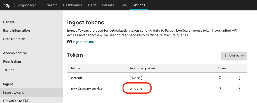 my-pingone-service), and assign the parser pingone. We are assigning the parser to the ingest token in LogScale as there is no option to assign the parser within the Ping Identity webhook setup.