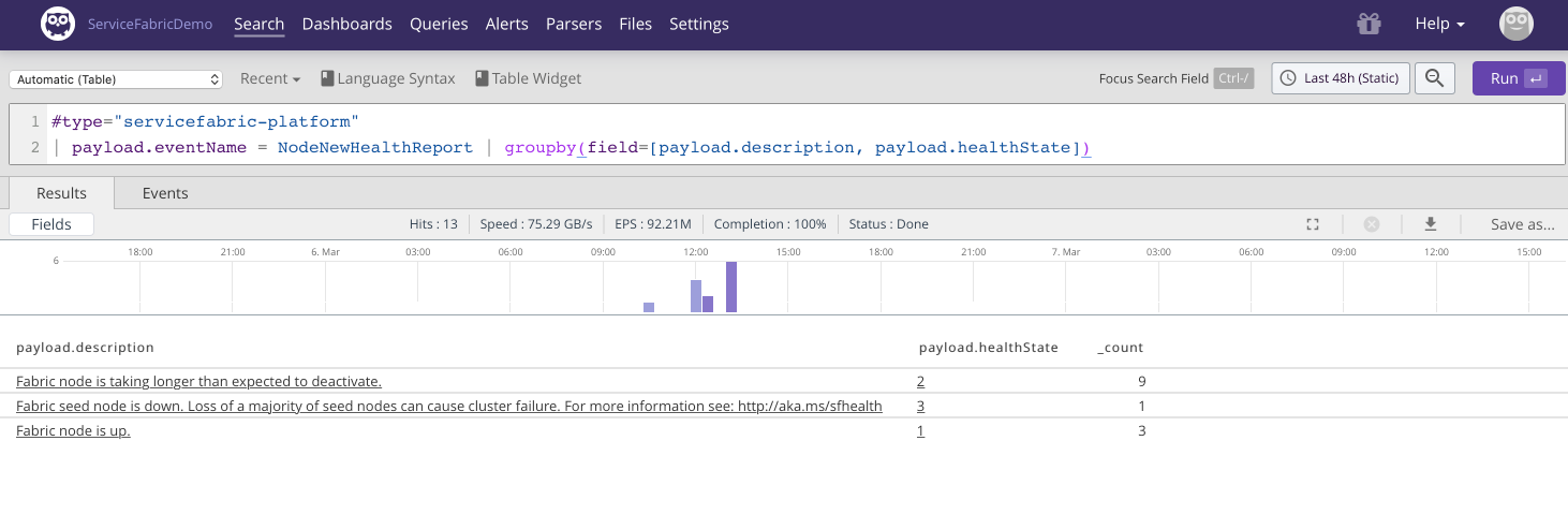| Platform | Service Fabric cluster and runtime using ETW. | ClusterMonitor service, using Microsoft.Diagnostics.EventFlow | LogScale |