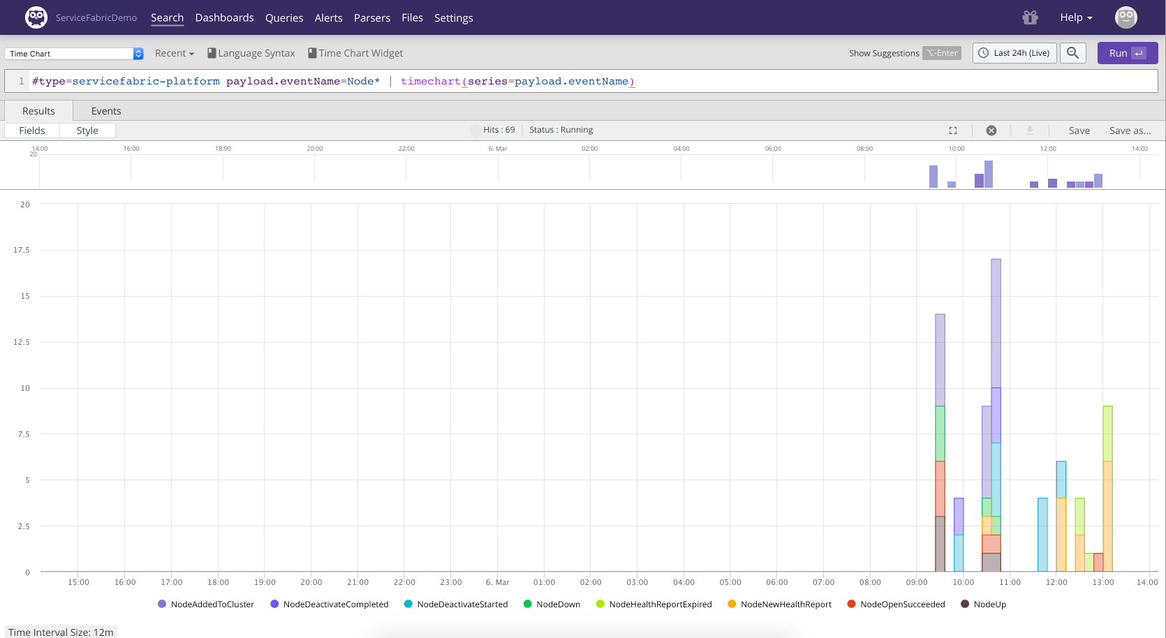 The following query visualizes the different node activities happening in the cluster the last 24 hours: