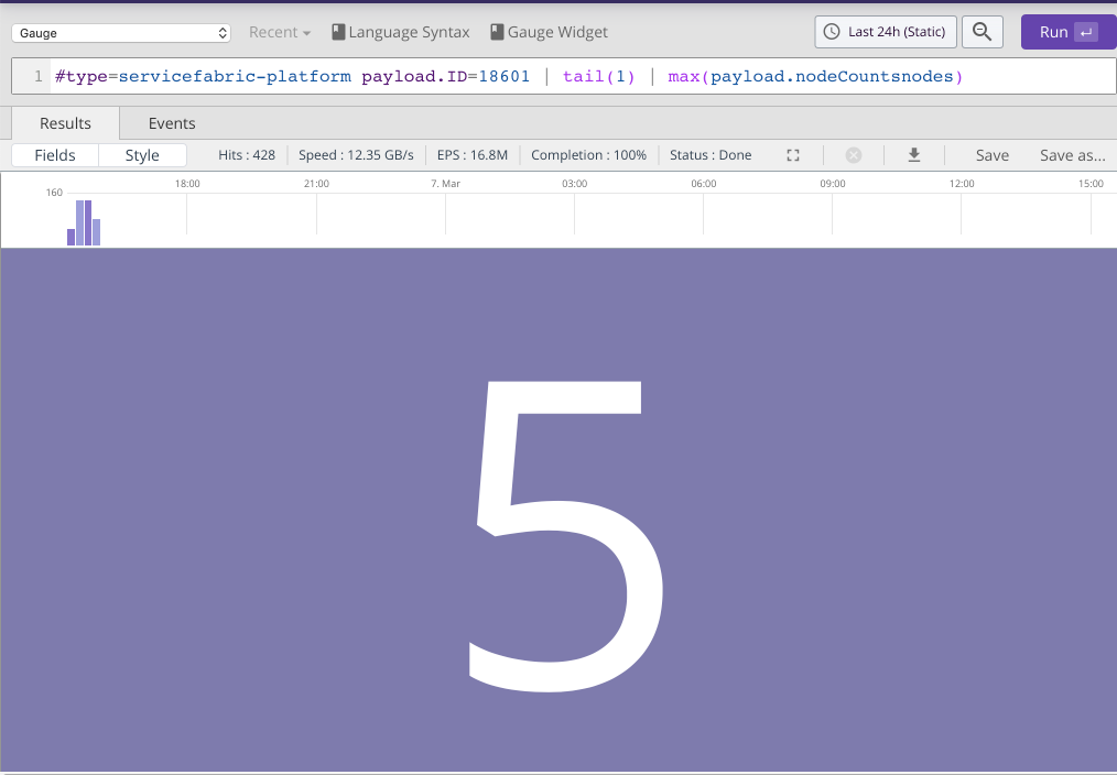 | max(payload.nodeCountsdownNodeCount)In the drop-down above the search text field we can select the widget type 'Gauge'. We can save to a new or existing dashboard by clicking Save as....