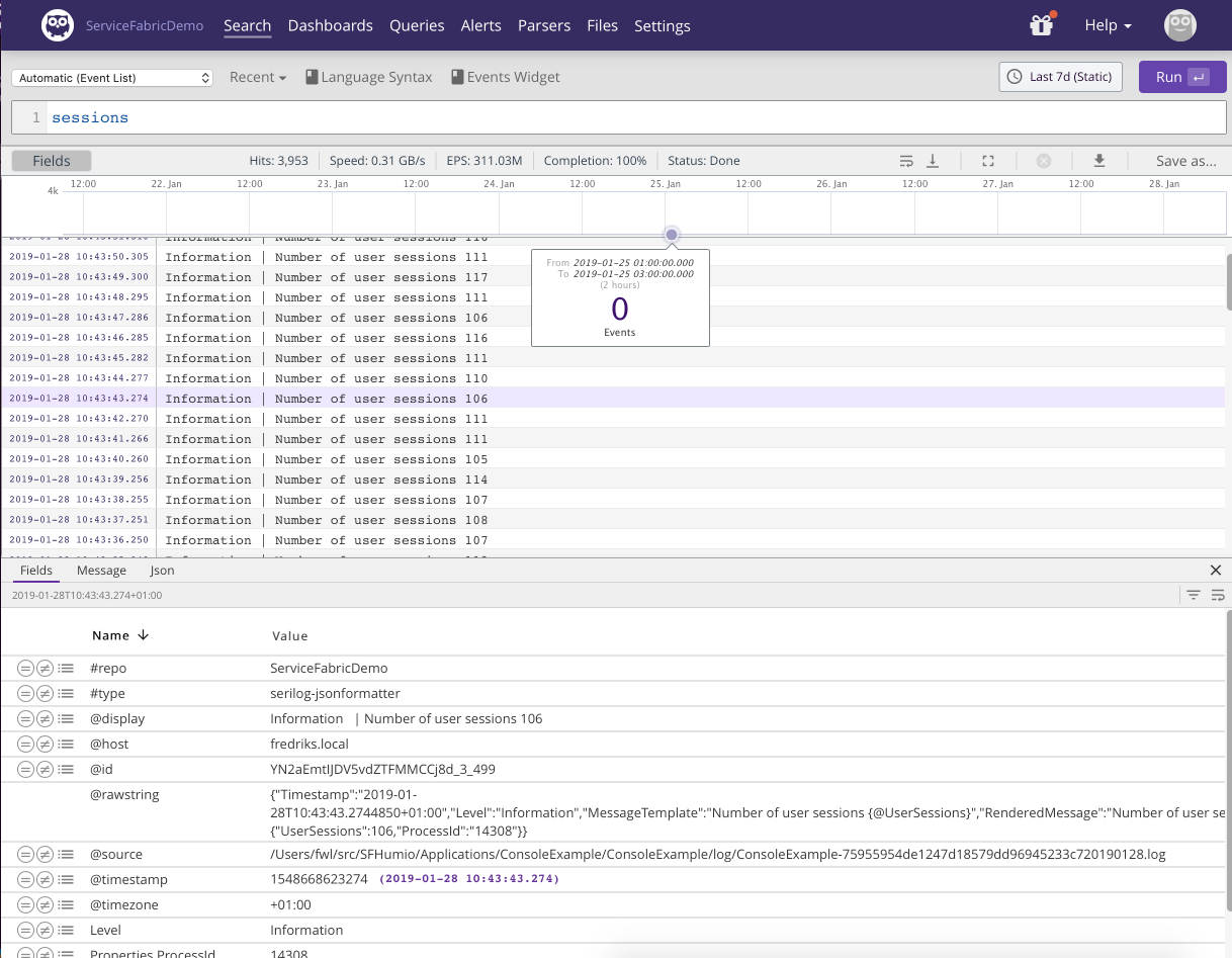 We have searched for the word sessions, the result is displayed below and a specific log line has been selected with the details shown below the event list.