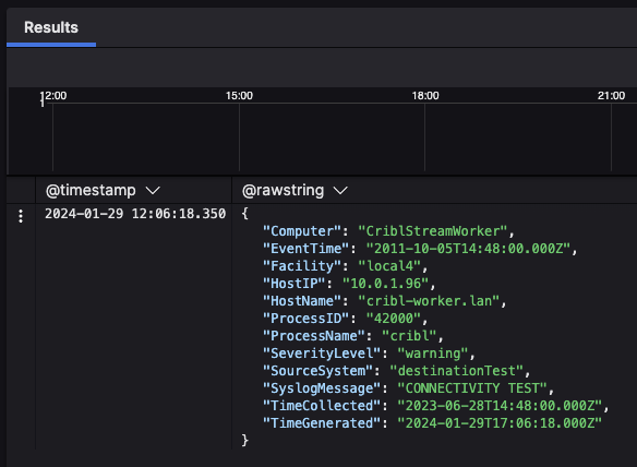 • The sample event sent from CrowdStream/CriblStream should now show in the LogScale repo defined as part of the destination setup