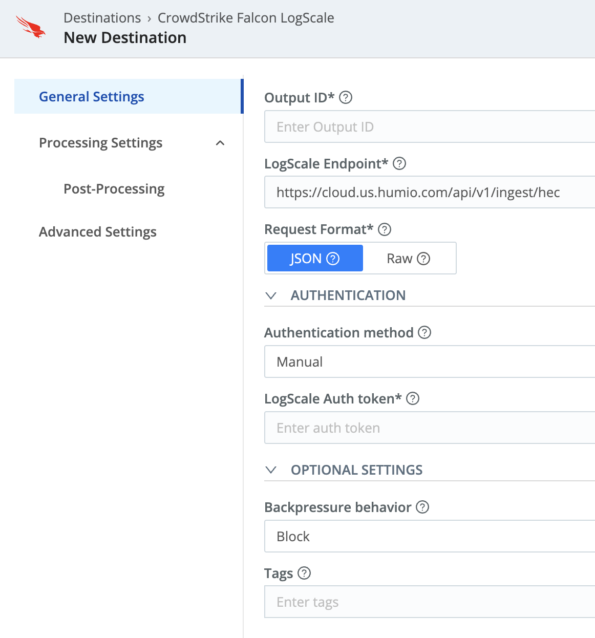 • From the new CrowdStrike Falcon LogScale destination list (Data > Destinations > search for "logscale")