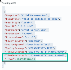 This sample test message can be manually updated - for example, can change the value of the "Computer" field from "CriblStreamWorker" to anything you want: