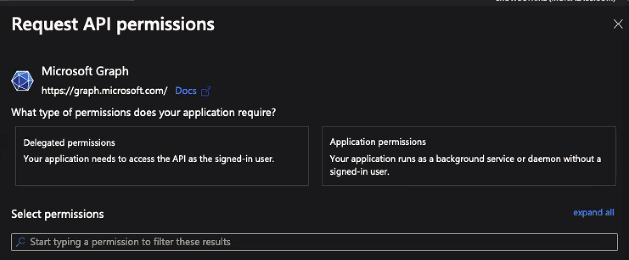 Note that there are 2 types of permissions, Delegated and Application.