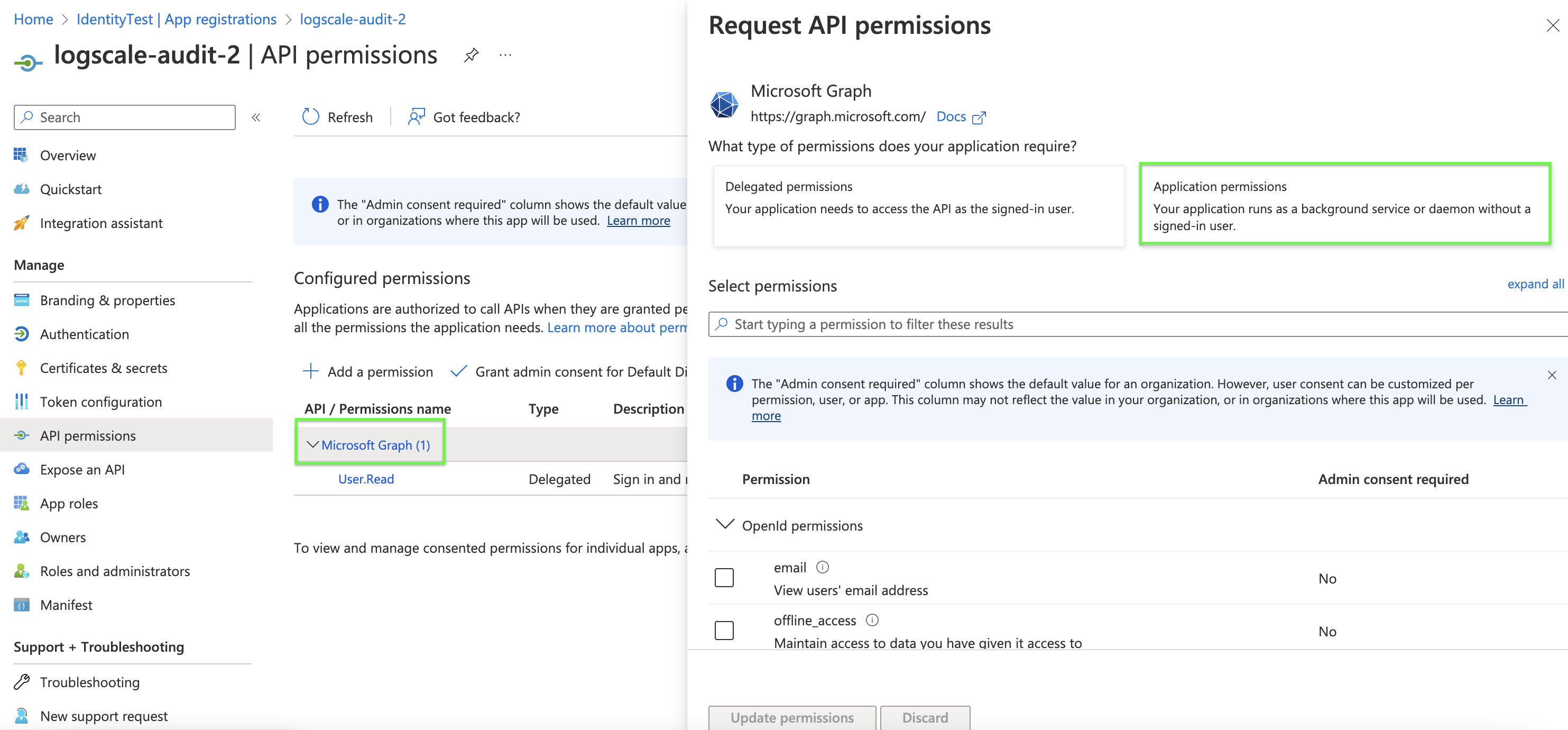 4. For the purpose of pulling audit logs, ensure you select Application Permissions