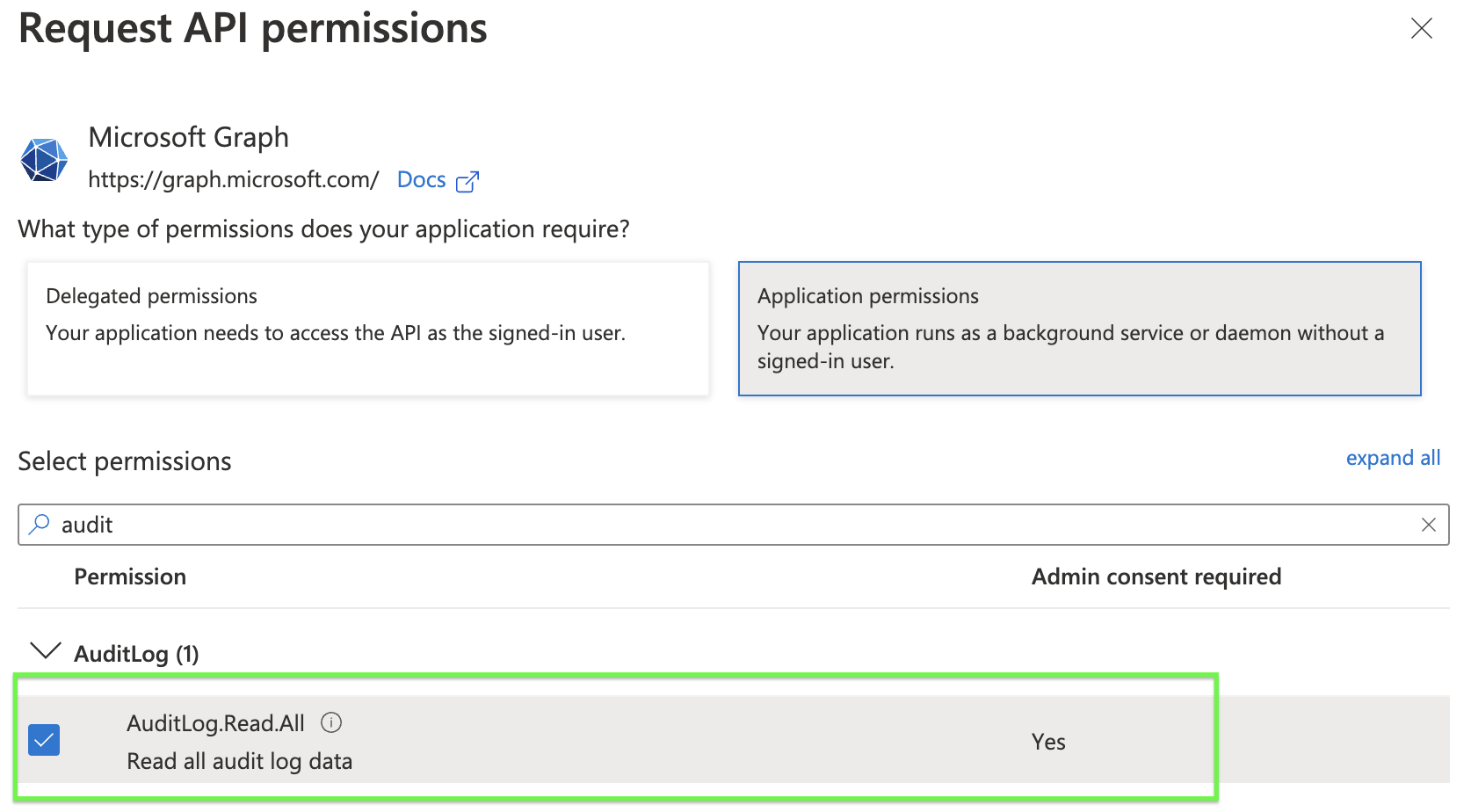 Select the checkbox for AuditLog.Read.All